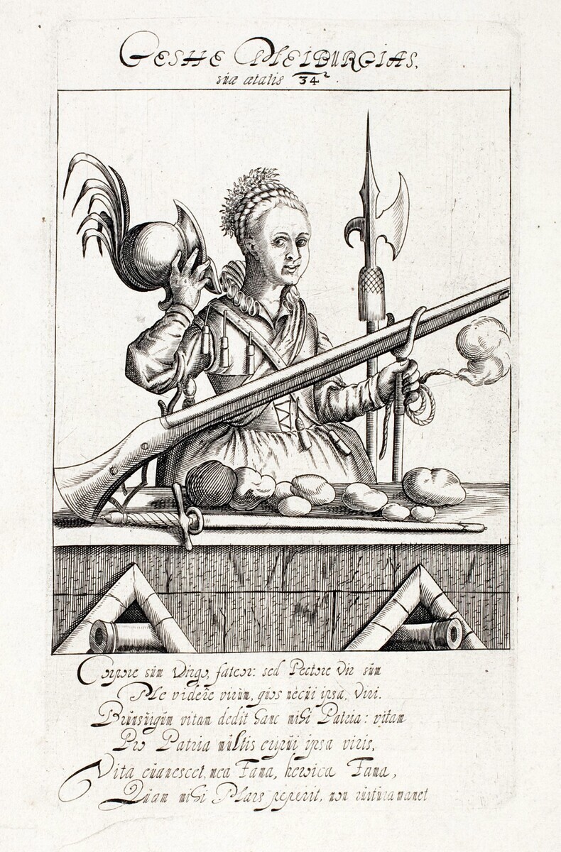 ドイツのジャンヌ・ダルク(ブラウンシュヴァイクのジャンヌ・ダルク)。ブラウンシュヴァイクは以前から攻撃を受けていた。13回目にして最大の危機が訪れる。砦からの砲撃で住民への被害は最大にまで膨らんだ。防衛軍の活躍も期待できない。敵軍が市内に突入したことによる乱戦。絶対的な危機となる。そんな中で現れた救世主こそが、ゲッシェ・マイブルクだ。市民は女性を含んで戦うことを決断した。その中でも孤軍奮闘の活躍をしていたゲッシェ・マイブルクは剣とマスケット銃を持って、防戦に努めた。仲間たちを鼓舞しながら戦う姿に敵軍からも恐れられた。500発の銃弾が当たらなかったことから不死身であると評された。